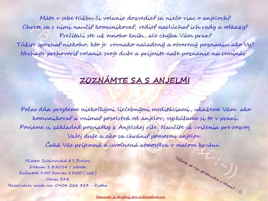 Úvodná stránka > Seminár - Zoznámte sa s anjelmi 1.3.2014 v Prešove!!